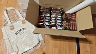 ヒロセ通商から株主優待が来た。今年は、少し箱が小さいなーと思ったら、トートバッグが入ってた。その他は、以下の通り。カレンダーレトルトカレー15個240gパックご飯10個インスタントラーメンはあんま好きじゃなかったから、無くなったのは良かった...